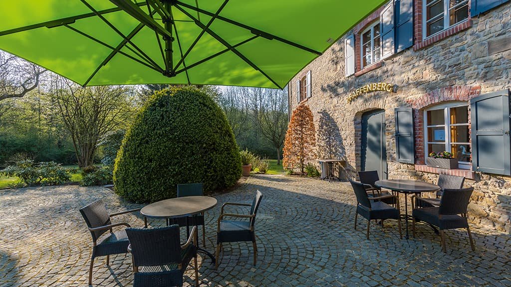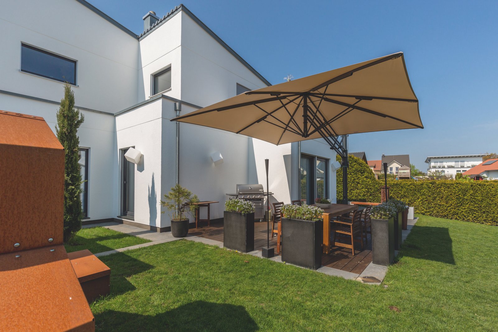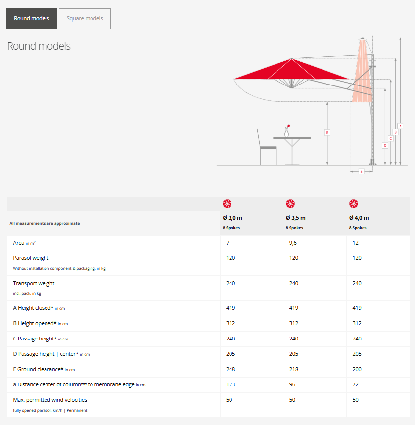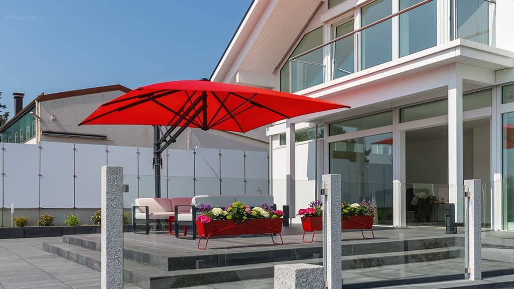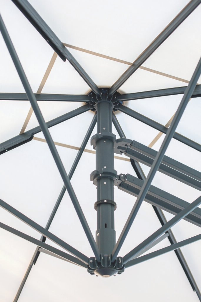 The space covered by the Jumbrella outSide ranges from 7 m2 through 16 m2. As a cantilever parasol it achieves its visual lightness through the lateral pole. This makes the membrane provide free shaded space without any obstacles. The technical sturdiness for stabilization steps to the side and thus into the background. The additional equipment extends the functional design with even more comfort and coziness.