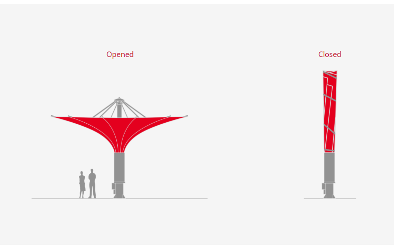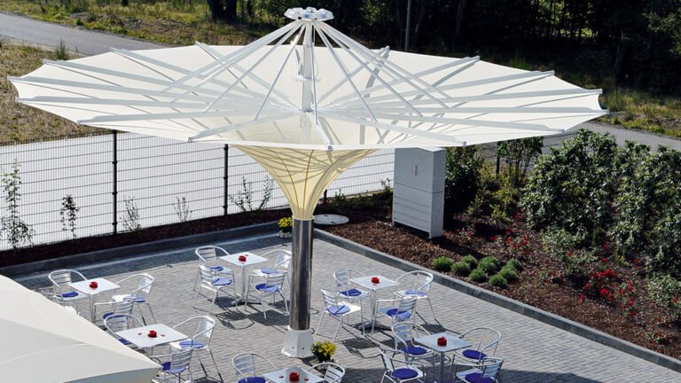 Technically Largo is our most elaborate model. The impressive, large-size parasol has an unusual and elegant shape opening upwards like a tulip. The underlying principle of a parasol is literally turned »upside down«. Only the textile covering and the cladding of the center pole are visible. Other technical details are nearly all hidden in the parasol. Pure premium beauty. The parasol’s sturdiness is guaranteed for wind speeds of up to a max. of 130 km/h.