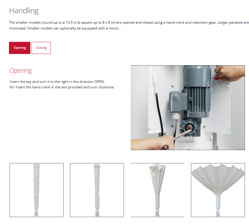 Service greatly influences the life span of a parasol. The exchangeable textile membrane of a Bahama parasol can – after being exposed to all sorts of weather conditions for years – be cleaned or replaced. Our service makes a full technical and general overhaul of the product such that they not only look attractive, but can defy the strongest of winds.